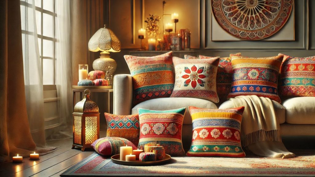You can place these accessories in decorative holders or arrange them on trays in your living and dining room. Scented candles in fragrances like sandalwood or jasmine accentuates the festive feel.