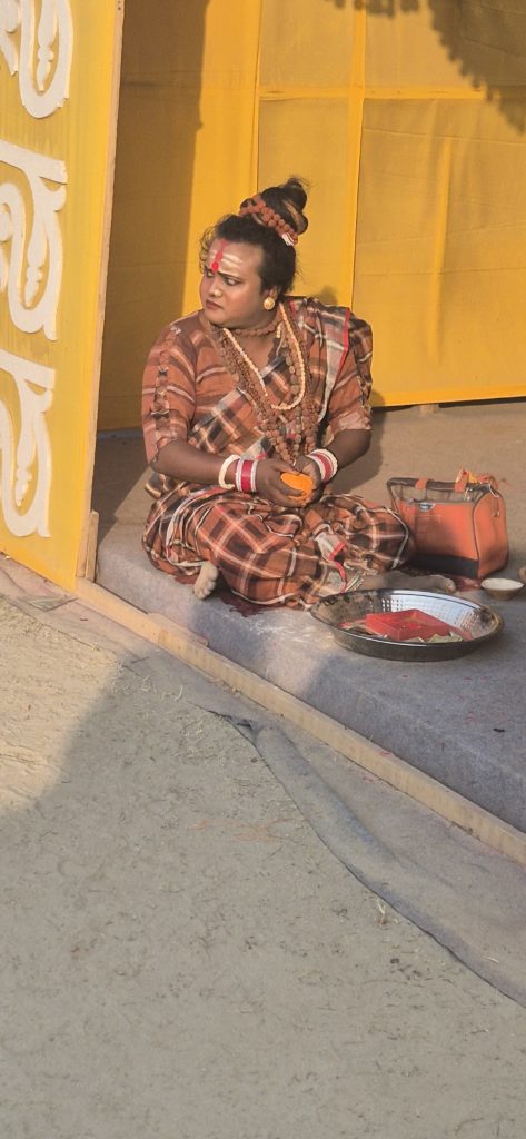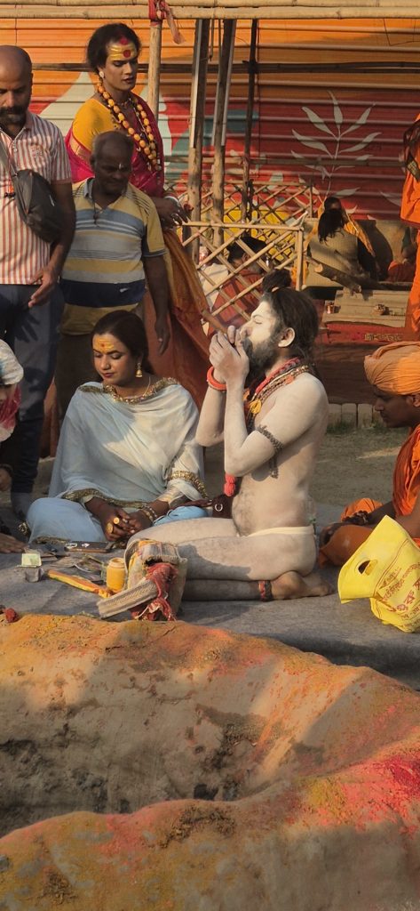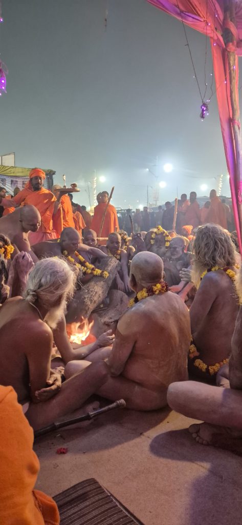 The next morning, we set out again, this time planning to visit all the Akharas on the other side of the Triveni Ghat. Fortuitously, we met two bikers who became our guides for the day, taking us wherever we wanted to go. Our first stop was the Kinnar Akhara in Sector 16, where we witnessed the Kali Puja. We realied that the whole of Kumbh city was divided in Sectors, almost in a linear fashion. We then visited other Akharas, speaking with numerous Sadhus along the way. Our goal was to understand their lifestyle and practices. Our final destination was the Juna Akhara, where we spent the evening with many Sadhus, observing their preparations for the Shahi Snan. We also saw many young people who were there to be initiated as Sadhus after the Shahi Snan the following morning. Throughout the day, events seemed to align perfectly, guiding us toward our ultimate goal – witnessing the Shahi Snan and taking a holy dip at the auspicious moment.